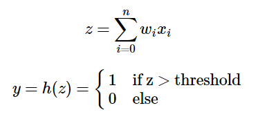 퍼셉트론은 입력값과 편향 값에 가중치(weight)를 곱하여 합한 값 즉, '가중치 곱의 합'이 임계치(threshold)를 넘어가면 1, 그렇지 않으면 0을 출력하는 활성화 함수(activation function)를 가집니다. 여기서 주목해야 할 점은 출력 값이 0 또는 1로 둘 중 하나라는 것입니다.
